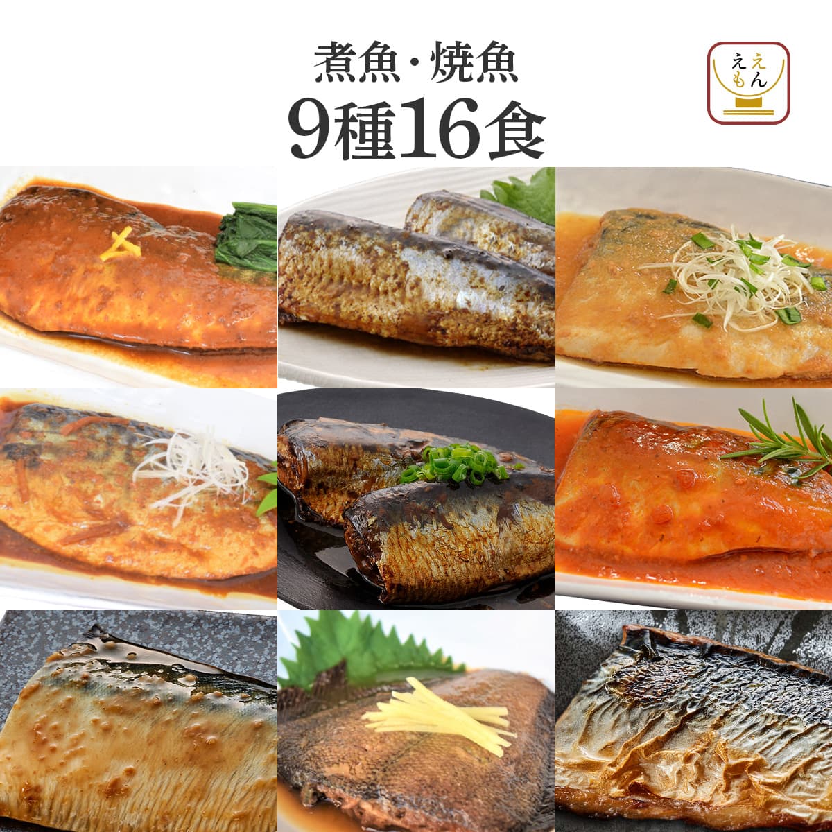 | 内容量 | ■ レトルトパウチ いわしの醤油煮 150g×2 いわしの黒酢煮 150g×2 さばの味噌煮 100g×2 さばの醤油煮 100g×2 さばのトマト煮 100g×2 さばのみぞれ煮 100g×2 かれいの煮付け 100g×2 ■ トレー さばの味噌煮 1枚×1 さばの塩焼き 1枚×1 9種 16食 |