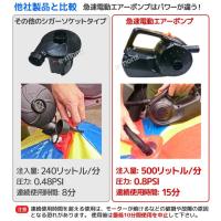 当、電動エアーポンプは、毎分500リットルを注入、連続使用時間も15分と長めなので、一度の使用で大量の空気を注入することができます。 エアーマット、ビニールプール, ゴムボートなど大型のエアー製品の空気注入がより早く済ませられます。