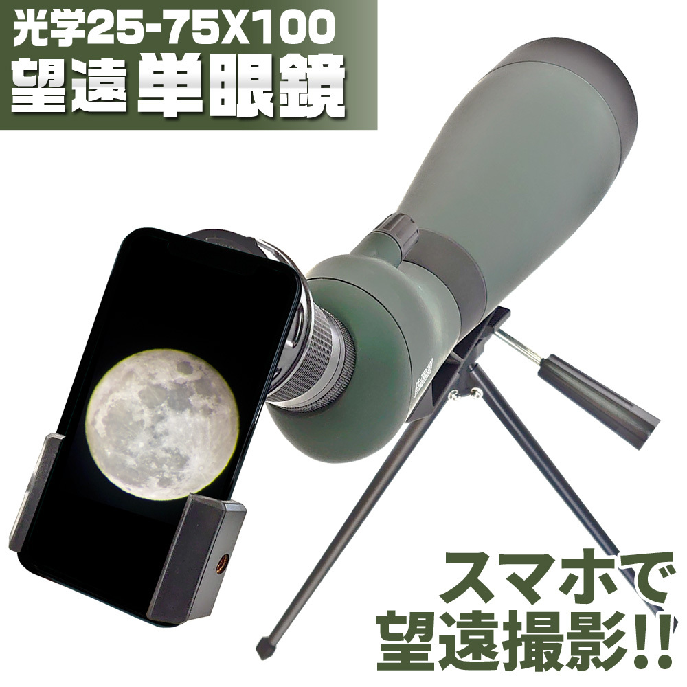 当、単眼望遠鏡は光学25-75倍ズーム、ピント調節、100mmの対物レンズを搭載した高性能望遠鏡です。 その性能は、8-10km離れた船舶の文字をはっきりと読めるほど識別が可能であり、月のクレーターの陰影による地形がわかるほど高精細の像を捉える事ができます。