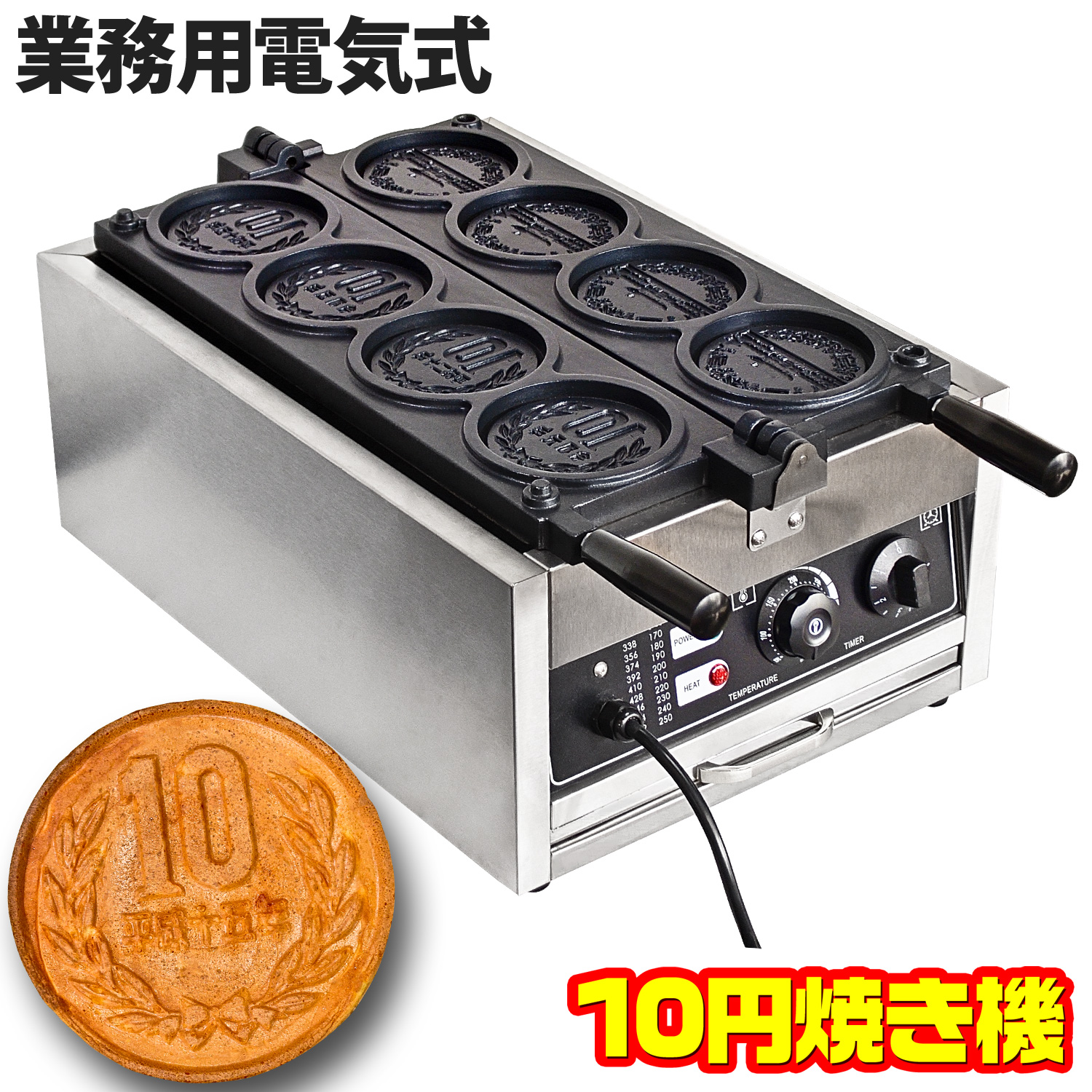 年号が4種もある巨大な10円玉の金型プレートで、一度に4個の10円焼きが作れる業務用電気調理器具です。電源は日本国内の家庭用のコンセントに対応しているので、一般の店舗、キッチンカー、屋台での出店の際でも安心して直ぐにご使用になれます。