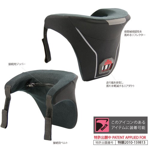 対応ジャケットに装着可能なネックプロテクター 装着感が良く後方視認性も損なわないシンプルな形状の単体で装着できるネックプロテクターです 適度な弾力性を持たせ、ヘルメット着用状態でのアクシデント時の頭部の過度の動きを抑制し、頸椎損傷等のリスクを低減できます