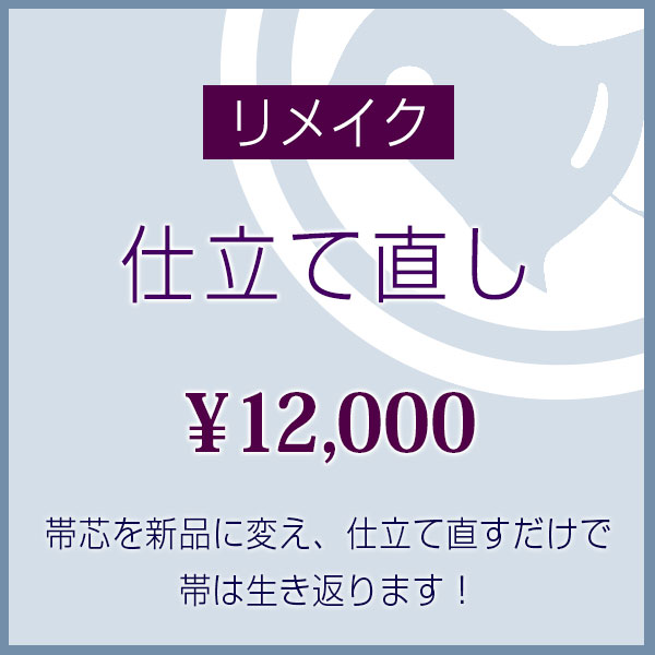 仕立て直しで帯は生き返ります! 古い帯の帯芯は、湿気でカビが生えてしまい、張りがありません。 一度帯を解き、帯芯を新品に変え張りのある仕立てを行うだけで、 帯は生き返り、帯の寿命も延びるのです! 現在の帯芯にかえるだけで、帯の重さも軽くなり、 腰への負担もなくなるイイこと尽くし!