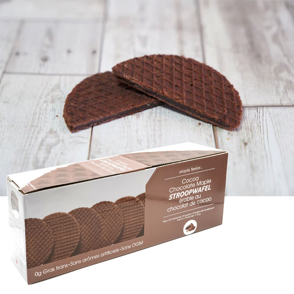 100%ピュアメープルシロップとココアパウダーを、良質なカナダ産の小麦粉と卵で作ったワッフルに挟み込みました。大勢に配れる35枚入りです。