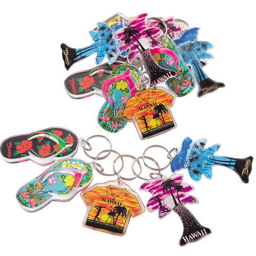 ビーチサンダルやヤシの木などをモチーフにした、色鮮やかなキーホルダーのセット。