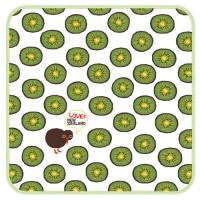 ニュージーランドを代表する動物、キウイバードとフルーツのキウイ柄がキュート。キッチンを明るく彩るふきんです。