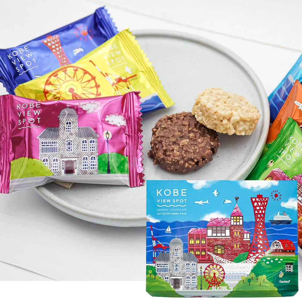 神戸の人気観光スポットをポップに描いたパッケージが人気の商品。人気の塩バターキャラメル味、ミルク味のクランチチョコレートの詰め合わせです。