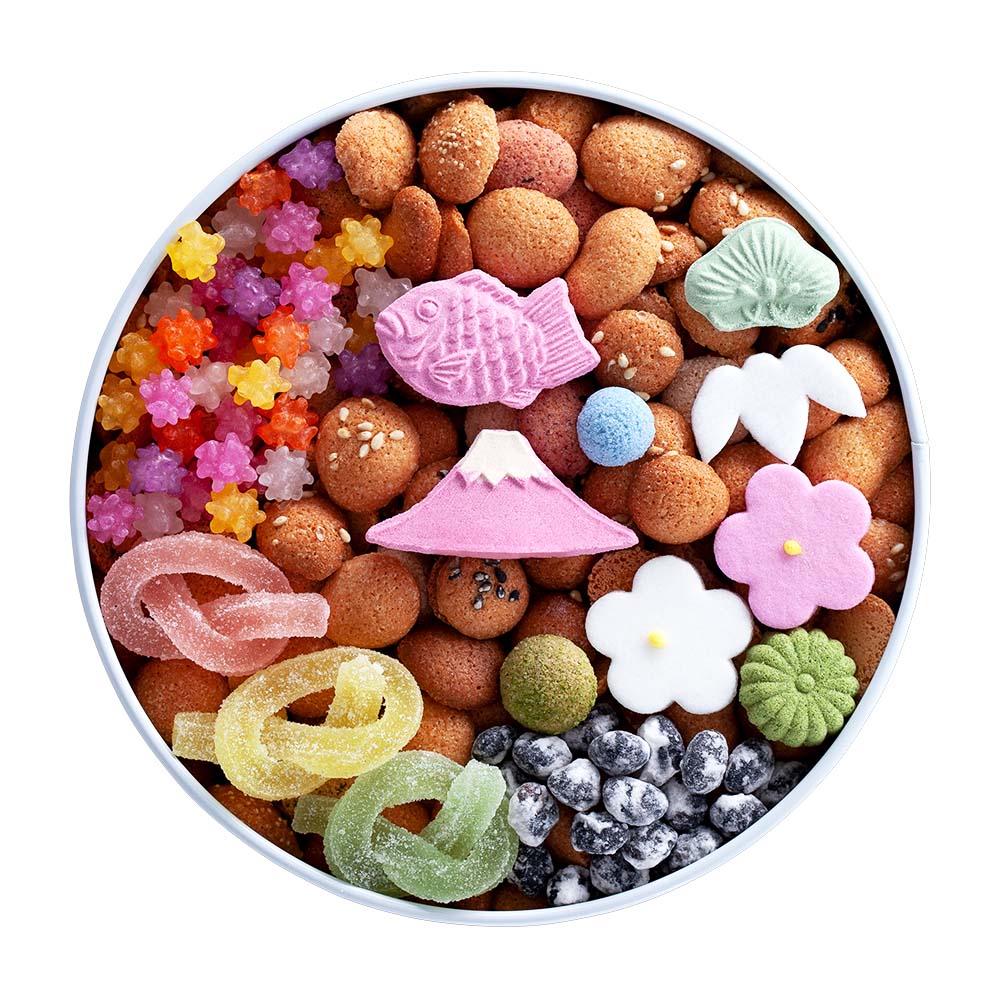 松竹梅の先に、めったにお目にかかれない赤富士とはねた鯛が祝福する逸品。人生の節目のお祝や頑張ったことの喜びと感謝を、白とゴールドの缶に詰め込みました。老舗和菓子店、銀座菊廼舎(きくのや)から、登録商標「冨貴寄」の“寿ぐ(ことほぐ)”をお届けいたします。