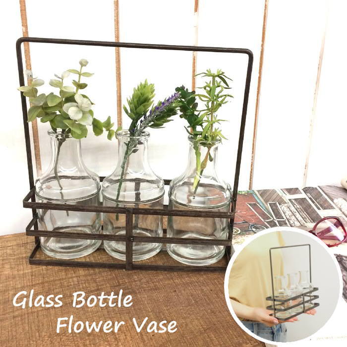 ブリュージュ ガラスボトルフラワーベース アイアンホルダー付き トリプル フラワーベース 花瓶 フラワースタンド おしゃれ 花瓶置き台 一輪挿し 花びん