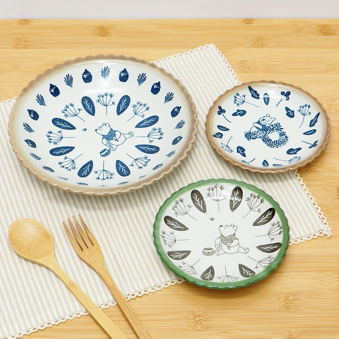 ●緑豊かな森の中で過ごす、くまのプーさんを描いたテーブルウェア。大皿1枚と取り皿2枚のプレートセットです。