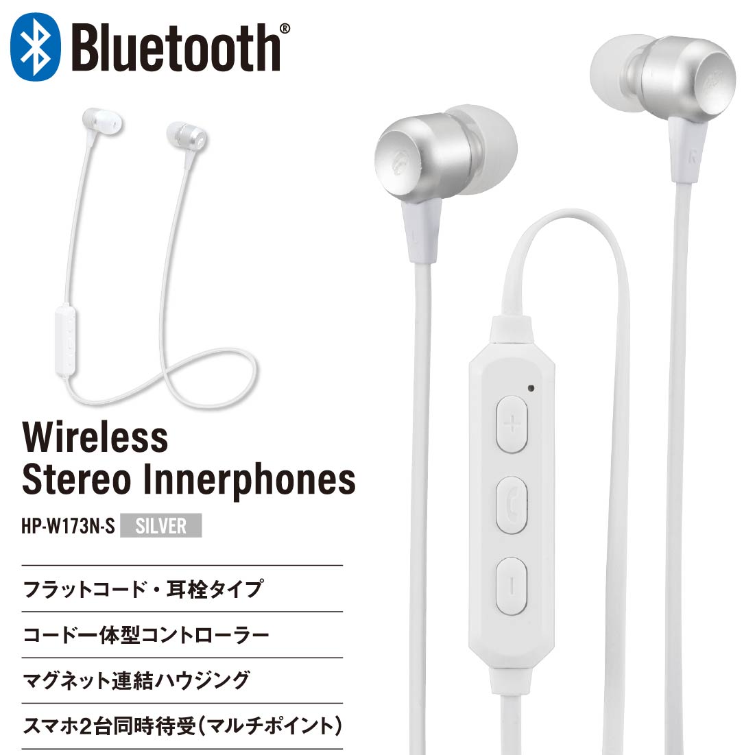 ワイヤレスイヤホン AudioComm ステレオインナーホン シルバー|HP-W173N-S 03-2496 オーム電機