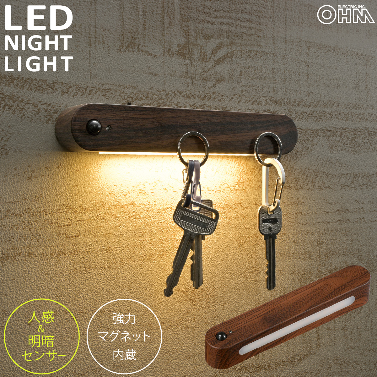 LEDナイトライト 人感&明暗センサー付き 濃い木目調|NIT-BK06-K 06-3812 オーム電機