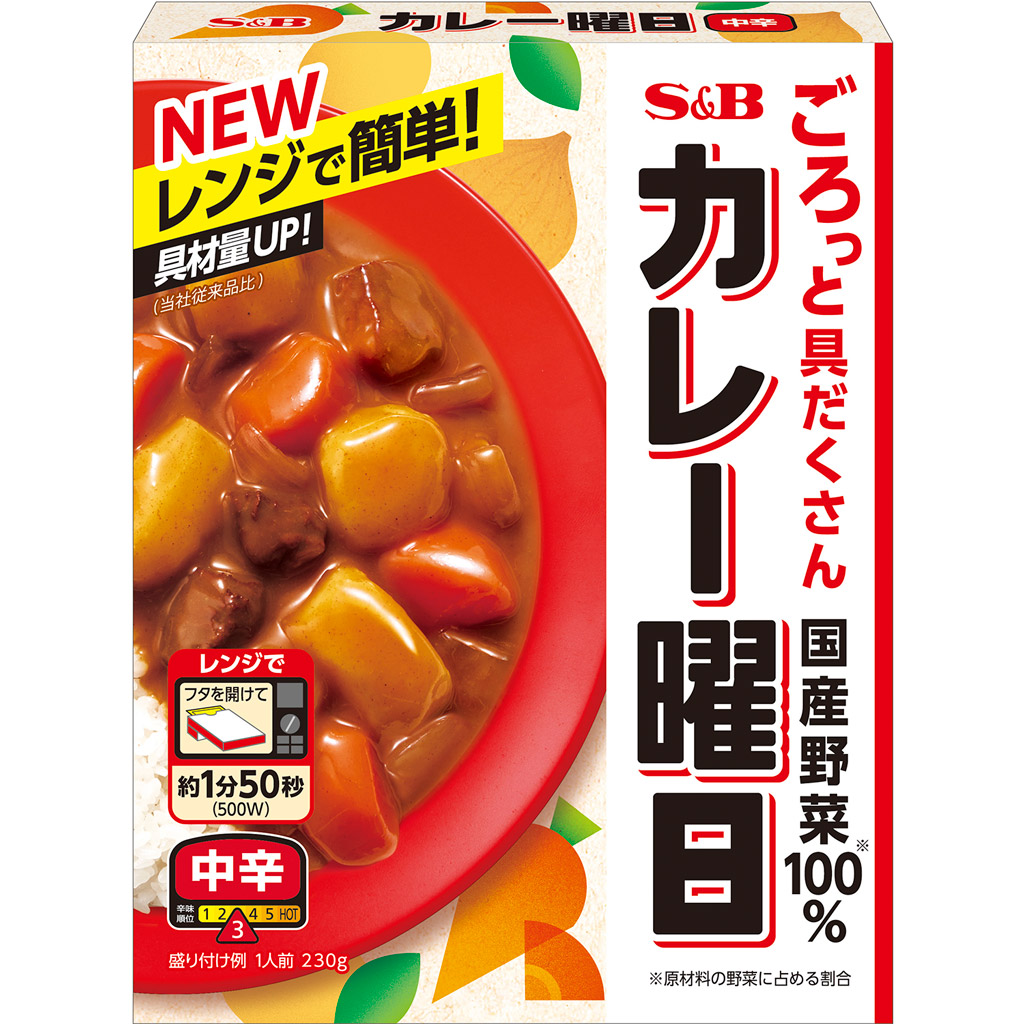 原材料名:野菜(じゃがいも(国産)、玉ねぎ、人参)、スパイス煮込み牛肉(牛肉、食塩、香辛料)、ソテー・ド・オニオン、小麦粉、チキンエキス、砂糖、牛脂豚脂混合油脂、カレー粉、食塩、パーム油・なたね油混合油脂、醸造酢、バナナフレーク、ポテトペースト、野菜ブイヨン、デキストリン、野菜ペースト、ビーフオイル/調味料(アミノ酸等)、カラメル色素、pH調整剤、増粘剤(加工デンプン、増粘多糖類)、塩化Ca、酸味料、乳酸Ca、(一部に小麦・牛肉・大豆・鶏肉・バナナ・りんごを含む)