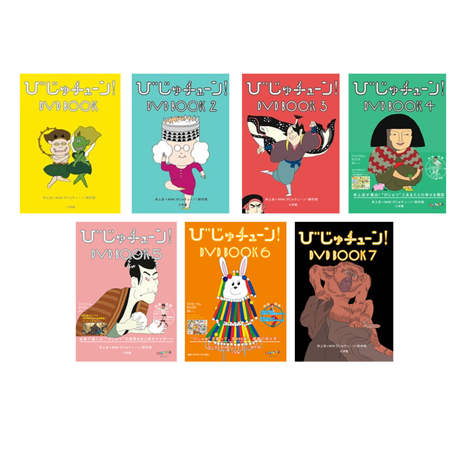 | 新進気鋭のアーティスト、井上涼が作詞・作曲・うた・アニメーションを手がける話題の番組「びじゅチューン!」(NHK Eテレ)。世界中の有名な美術作品が、一度聞いたら耳から離れない歌と、あたたかいタッチのアニメーションになって、私たちのハートをわしづかみにします。この番組の魅力を、特典映像たっぷりのDVDと読み応え抜群のBOOKで、さらに深く掘り下げました。DVDにもBOOKにも、初公開のとっておきの内容が詰まっています。 【セット内容】 ●びじゅチューン!DVD BOOK ●びじゅチューン!DVD BOOK 2 ●びじゅチューン!DVD BOOK 3 ●びじゅチューン!DVD BOOK 4 ●びじゅチューン!DVD BOOK 5 ●びじゅチューン!DVD BOOK 6 ●びじゅチューン!DVD BOOK 7 ●びじゅチューン!DVD BOOK 著/井上涼+NHKびじゅチューン!制作班 DVD(全80分)では、人気16作品のうた、かいせつ、カラオケバージョンがそれぞれ楽しめます。また、撮り下ろしの特典映像“おどってみよう!「ルソー5」”(ふりつけ・ダンス/井上涼)、“ご存じ?びじゅチューン!”を収録。 BOOK(全80ページ)では、井上涼作品のヒミツを知りながら、題材となった美術作品の理解を深めます。各作品の構想スケッチや音楽のワンポイント解説、描きおろしイラストやメッセージも! 【ISBN】9784094803167 【判型/頁】A5判/80頁 【発売日】2015年04月24日 ●びじゅチューン!DVD BOOK 2 著/井上涼+NHKびじゅチューン!制作班 大好評の1巻目と同様に、DVD(全76分)には、「保健室に太陽の塔」「真珠の耳飾りのくノ一」「祖母のコロッセオハット」など、全16曲のうた(コーラス・バージョン)、解説、カラオケを収録。また、撮りおろし特典映像として、おどってみよう!「縄文土器先生」を収録。 BOOK(全80ページ)には、「びじゅチューン!」をさらに深く楽しむための情報満載。モチーフとなっている美術作品の解説、構想スケッチ、歌詞係や脇役キャラの由来、あのキャラがここにも登場!といった小ネタや制作のヒミツなど、初公開情報がたっぷりと書かれています。コラムでは、コーラスアレンジのヒミツを作曲家の吉岡弘行先生に、解説パートのつくり方を織田聡監督にうかがい、「びじゅチューン!」の魅力を多角的に掘り下げました。 【ISBN】9784094803181 【判型/頁】A5判/92頁 【発売日】2016年04月18日 ●びじゅチューン!DVD BOOK 3 著/井上涼+NHKびじゅチューン!制作班 3巻目は、DVD(全104分)に「武蔵の遅刻理由」「曜変天目ディスコ」「噴火する背中」などの人気作品を含む全16曲【スタジオ解説・うた(コーラス・バージョン)・カラオケ】に、番組内で歌の前に流れる“扉絵”を加えて収録しています。そして、特典映像が過去最大ボリュームに! 1.おどってみよう!「ナルキッソス天気予報」。<振り付けビデオ> 2.井上流 アニメのつくりかた 3. なつやすみ 美術館でびじゅチューン!<2016年夏放送の特集番組を再構成>の3本を収録。 BOOK(全80ページ)は、1〜2巻同様、収録曲の制作や設定のひみつと、美術作品解説が大充実。さらに、コラムには豪華ゲストが登場! 「洛中洛外シスターズ」「潜入捜査inムーラン・ド・ラ・ギャレット」などでゲスト参加をしているDJみそしるとMCごはんさん、美術史家の高階秀爾さんと井上涼さんとの対談も。びじゅチューン!の魅力をさまざまな角度から掘り下げます。 【ISBN】9784094803198 【判型/頁】A5判/80頁 【発売日】2017年08月02日 ●びじゅチューン!DVD BOOK 4 著/井上涼+NHKびじゅチューン!制作班 DVDに「夢パフューマー麗子」「睡蓮ノート」「特急三日月宗近」「何にでも牛乳を注ぐ女」などの人気作品を含む新曲全16曲が、スタジオ解説・うた(コーラスバージョン)・カラオケ付きで、また特典映像は、恒例の振り付け映像「おどってみよう!『ツボのツボマッサージ師』」、2017年夏に放送され好評だった特番「なつやすみ びじゅチューン!ツアーin関西」の2本を収録。 BOOKは、収録曲の制作や設定のひみつ、テーマになった美術作品の解説のほか、コーラスアレンジと指揮を担当する吉岡弘行さんのコラムを収録。ほかにも東京国立博物館で「びじゅチューン!」を生みだす独自の視点について井上涼さんが語るコラム、また国立西洋美術館を探訪して美術館の楽しみ方をさぐる取材記事など、充実の内容です。 【ISBN】9784094803594 【判型/頁】A5判/80頁 【発売日】2018年08月03日 ●びじゅチューン!DVD BOOK 5 著/井上涼+NHKびじゅチューン!制作班 人気曲「ツイスト出産」「写楽式洗顔」「夏秋草図屏風デート」などを含む、全16曲を収録。恒例の振り付けは「鮭ミラーボール」で、気分は80年代のダンスシーン! 2018年夏に放送されて反響のあった「なつやすみ!博物館で“にっぽんびじゅチューン!”」も収録され、ボリュームたっぷりの内容です。 【ISBN】9784094803600 【判型/頁】A5判/80頁 【発売日】2020年03月04日 ●びじゅチューン!DVD BOOK 6 著/井上涼+NHKびじゅチューン!制作班 ●DVD 「エスパーカフェ」「電気さえあれば」「ダンス寿司」などの人気作品を含む新曲全17曲を、スタジオ解説・うた(コーラス・バージョン)・カラ