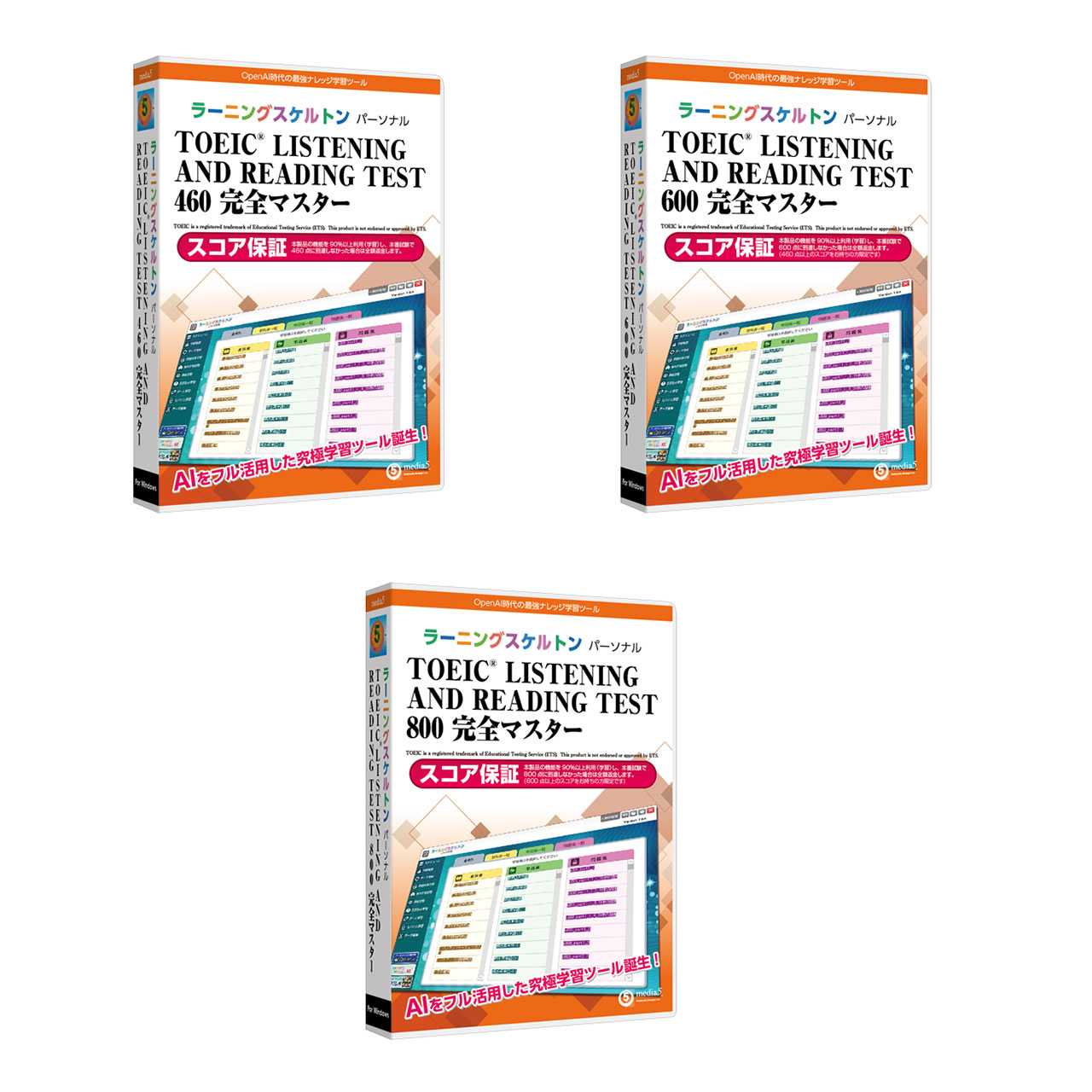 ![]() ![]() ![]() ![]() ●ラーニングスケルトン パーソナル TOEIC® LISTENING AND READING TEST 460 完全マスター 【収録学習内容】 ▼問題集 ●【新形式対応】トレーニング問題 Part 1〈写真描写問題〉(260) Part 2〈応答問題〉(300) Part 3〈会話問題〉(234) Part 4〈説明文問題〉(70) Part 5〈単文穴埋め問題〉(80) Part 6〈長文穴埋め問題〉(40) Part 7〈1つの文書・複数の文書〉(144) ▼単語帳 ●頻出英単語(1403) ●頻出英熟語(329) ▼教科書 ●文の構造と種類 ●名詞 ●代名詞 ●関係代名詞と関係副詞 ●形容詞 ●冠詞 ●動詞 ●不定詞 ●動名詞 ●分詞 ●話法 ●時制 ●受動態と能動態 ●叙法 ●パラグラフリーディング入門 ●パラグラフの論理構成 ●長文読解訓練 【JAN】4512397510872 ●ラーニングスケルトン パーソナル TOEIC® LISTENING AND READING TEST 600 完全マスター 【収録学習内容】 ▼問題集 ●【新形式対応】トレーニング問題 Part 1 〈写真描写問題〉(180) Part 2 〈応答問題〉(180) Part 3 〈会話問題〉(148) Part 4 〈説明文問題〉(74) Part 5 〈単文穴埋め問題〉(80) Part 6 〈長文穴埋め問題〉(40) Part 7 〈1つの文書・複数の文書〉(148) ▼単語帳 ●頻出英単語(1602) ●頻出英熟語(359) ▼教科書 ●文の構造と種類 ●名詞 ●代名詞 ●関係代名詞と関係副詞 ●形容詞 ●冠詞 ●動詞 ●不定詞 ●動名詞 ●分詞 ●話法 ●時制 ●受動態と能動態 ●叙法 ●パラグラフリーディング入門 ●パラグラフの論理構成 ●長文読解訓練 【JAN】4512397510889 ●ラーニングスケルトン パーソナル TOEIC® LISTENING AND READING TEST 800 完全マスター 【収録学習内容】 ▼問題集 ●【新形式対応】トレーニング問題 Part 1 〈写真描写問題〉(120) Part 2 〈応答問題〉(90) Part 3 〈会話問題〉(90) Part 4 〈説明文問題〉(82) Part 5 〈単文穴埋め問題〉(120) Part 6 〈長文穴埋め問題〉(56) Part 7 〈1つの文書・複数の文書〉(194) ▼単語帳 ●頻出英単語(1798) ●頻出英熟語(400) ▼教科書 ●文の構造と種類 ●名詞 ●代名詞 ●関係代名詞と関係副詞 ●形容詞 ●冠詞 ●動詞 ●不定詞 ●動名詞 ●分詞 ●話法 ●時制 ●受動態と能動態 ●叙法 ●パラグラフリーディング入門 ●パラグラフの論理構成 ●長文読解訓練 【JAN】4512397510896 【動作環境】 ■1.6GHz以上のCPU(2GHz以上推奨) ■DVD-ROMドライブ(パッケージ版) ■Windows互換のサウンドカード ■Microsoft Windows 11 / 10(日本語版) *管理者権限でご使用下さい。 ■True Color表示可能な解像度 1366×768以上のディスプレイ ■メモリ 4GB以上(8GB以上推奨) ■3GB以上のハードディスクドライブの空き容量が必要 ■インターネットに接続できる環境(ブロードバンド環境推奨) ■Microsoft Edge / Google Chrome