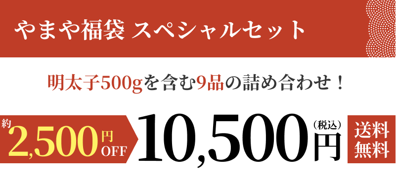 中身は届いてからのお楽しみ!やまや福袋(辛子明太子500g、博多もつ鍋、うまだし10包、明太フランス含む計9品入り)
