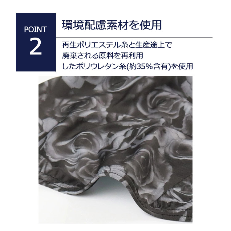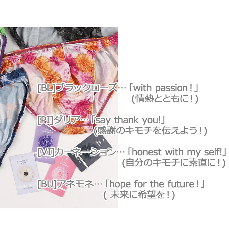毎日のモチベーションを高めてくれるような、華やかなお花のデザイン。 4種の花柄デザインで、クリスマスやバレンタインデー、誕生日や記念日など、プレゼントとしてもおすすめです。 フロント部分の快適なフィット感を追求。 ハイレッグ、前閉じタイプ。 環境配慮素材を使用。 本体生地に、再生ポリエステル糸と生産途上で廃棄される原料を再利用したポリウレタン糸(約35%含有)を使用。 オリジナルハナコトバ [BU]アネモネ…どんな毎日も「hope for the future!」( 未来に希望を!) [BL]ブラックローズ…どんな毎日も「with passion!」(情熱とともに!) [PI]ダリア…どんな毎日も「say thank you!」(感謝のキモチを伝えよう!) [VI]カーネーション…どんな毎日も「honest with my self!」(自分のキモチに素直に!) 素材:ポリエステル90%、ポリウレタン10% 株式会社ワコール 洗濯機可 |