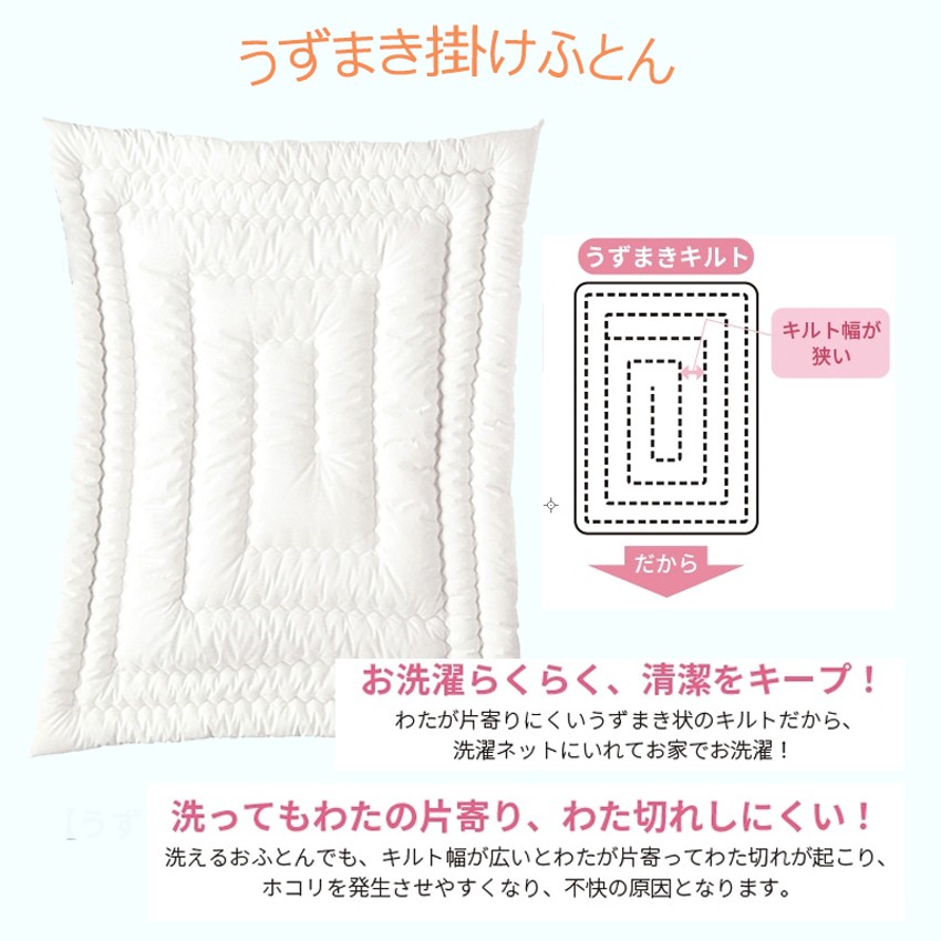| 仕様 | 【うずまきキルト掛けふとん】 ふとんがわ:綿100% 詰めもの:ポリエステル100% 440g(一部再生わた使用)