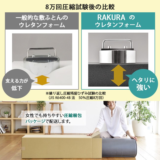 ・圧縮された製品を開封すると、中材のウレタンフォームが圧縮状態から解放されて膨らみ始めます。開封後、すぐご使用いただくことも可能ですが開封直後は、ウレタンフォームが柔らかく感じることがございます。開封してから約72時間程度で本来の厚み、硬さまで回復します。気圧・気温・湿度などの影響により、回復まで更に時間を要することがあります。回復が不十分な箇所がある場合は、その箇所を軽くもみほぐしてください。