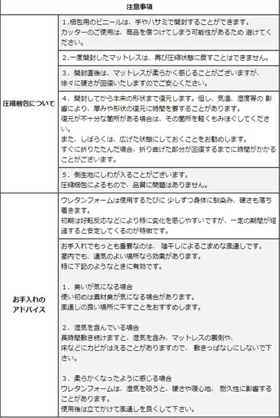 ・開封後、本来の厚みに回復するまでは、上に重いものを載せず広げた状態にしておくことをお勧めします。すぐに折りたたんだり、重いものを載せたりした場合、復元の妨げになり、回復するまでに時間がかかることがあります。