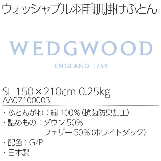 ウェッジウッド 羽毛肌掛け布団 SL ウォッシャブル0.25kg