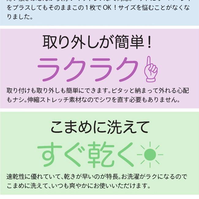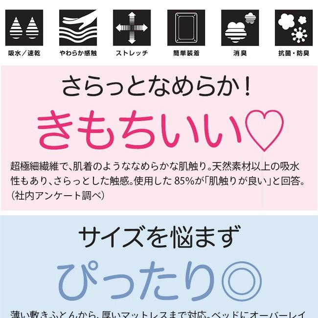 | コメント | サラッとなめらかな肌触り。超極細繊維で吸水性・速乾性に優れてます。また、ストレッチ素材なので簡単に装着ができます。消臭効果・抗菌&防臭加工の多機能を装備した敷きふとん&ベッドマットレスどちらにも対応のカバーリングシリーズです。敷きふとんからベッドマットレスまで対応します。付けるとずれにくく、しわになりにくいです。 |