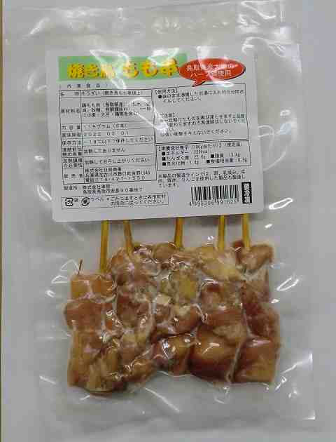 原材料:鶏もも肉(鳥取県産)、たれ(醤油、砂糖、発酵調味料)、(一部に小麦・大豆・鶏肉を含む) 内容量:115g(5本) 販売者:日岡商事