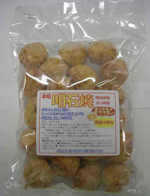 卵をふんだんに使い、ふっくらなめらかに焼き上げた明石焼き。添付の化学調味料無添加のだしつゆをつけてお召し上がりください。原材料:【たこ焼】液卵(国内製造)、小麦粉、タコ、植物油脂、植物たん白加水分解物、鰹節エキス、昆布エキス、鰹いわし粉末、食塩/加工でん粉、(一部に小麦・卵・大豆を含む)、【だしつゆ】醤油(国内製造)、削り節(さば、うるめ、かつお)、砂糖、みりん、食塩、(一部に小麦・大豆・さばを含む) 内容量:たこ焼き20個、だしつゆ100ml×2袋 販売者:日岡商事