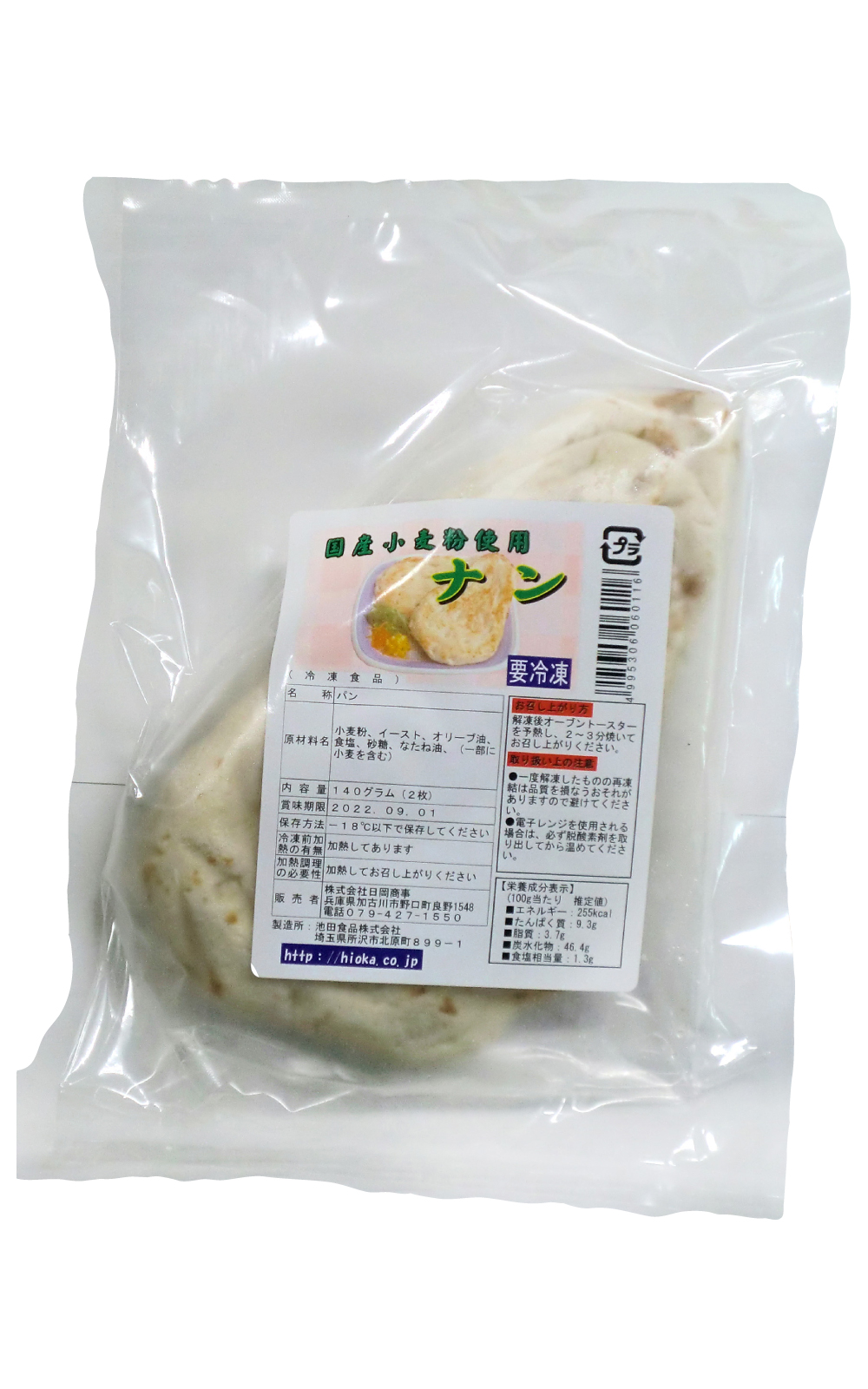 国産小麦粉のじっくりと熟成された生地を、高温で短時間に焼き上げ外はカリッと中はモッチリと仕上げました。カレー、バター、ジャムをつけたり、ハム、ソーセージ、野菜などを挟んでお召しあがり下さい。原材料:小麦粉、イースト、オリーブ油、食塩、砂糖、なたね油、(一部に小麦を含む) 内容量:70g×2枚入 販売者:日岡商事