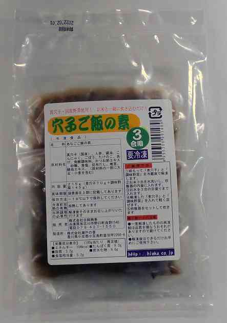 原材料:真穴子(国産)、人参、醤油、こんにゃく、ごぼう、たけのこ、あげ、発酵調味料、かつお節エキス、砂糖、食塩、昆布だし、椎茸、酵母エキス、(原材料の一部に大豆・小麦を含む) 内容量:3合用(煮穴子70g・調味野菜145g) 販売者:日岡商事
