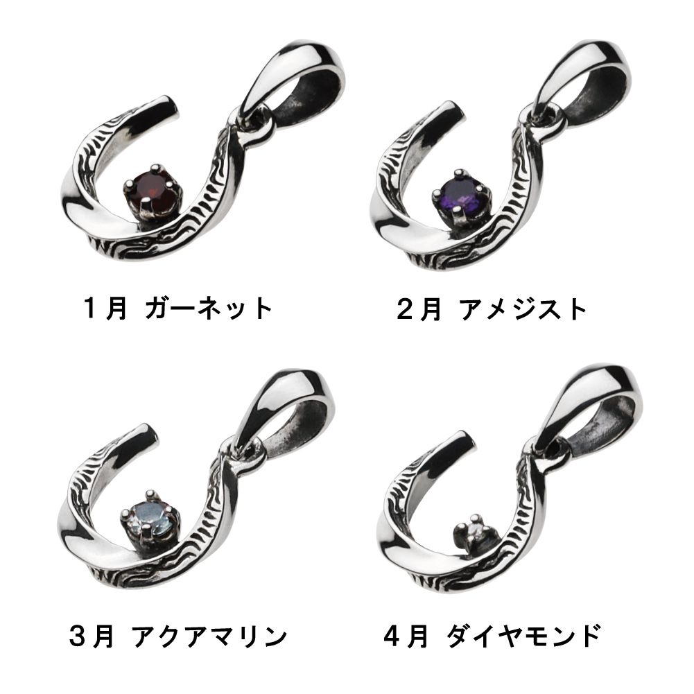 誕生石を小振りなホースシューの中にセットしたシルバーペンダントです。馬蹄は幸運を呼ぶ、魔除けになる等、昔から愛されてきたモチーフです。小振りなのでユニセックスで使えるので、贈り物やペア使いもおススメです。