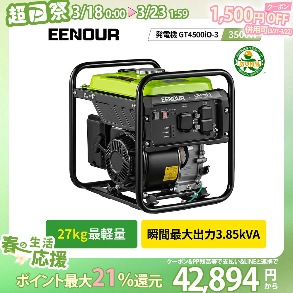 超日祭特価先行 インバーター発電機 EENOUR ガソリン式 開放型 最大3.85kVA オープン型 静音 軽量 正弦波 農業用 工事現場 自家用 GT4500iO-3 防災