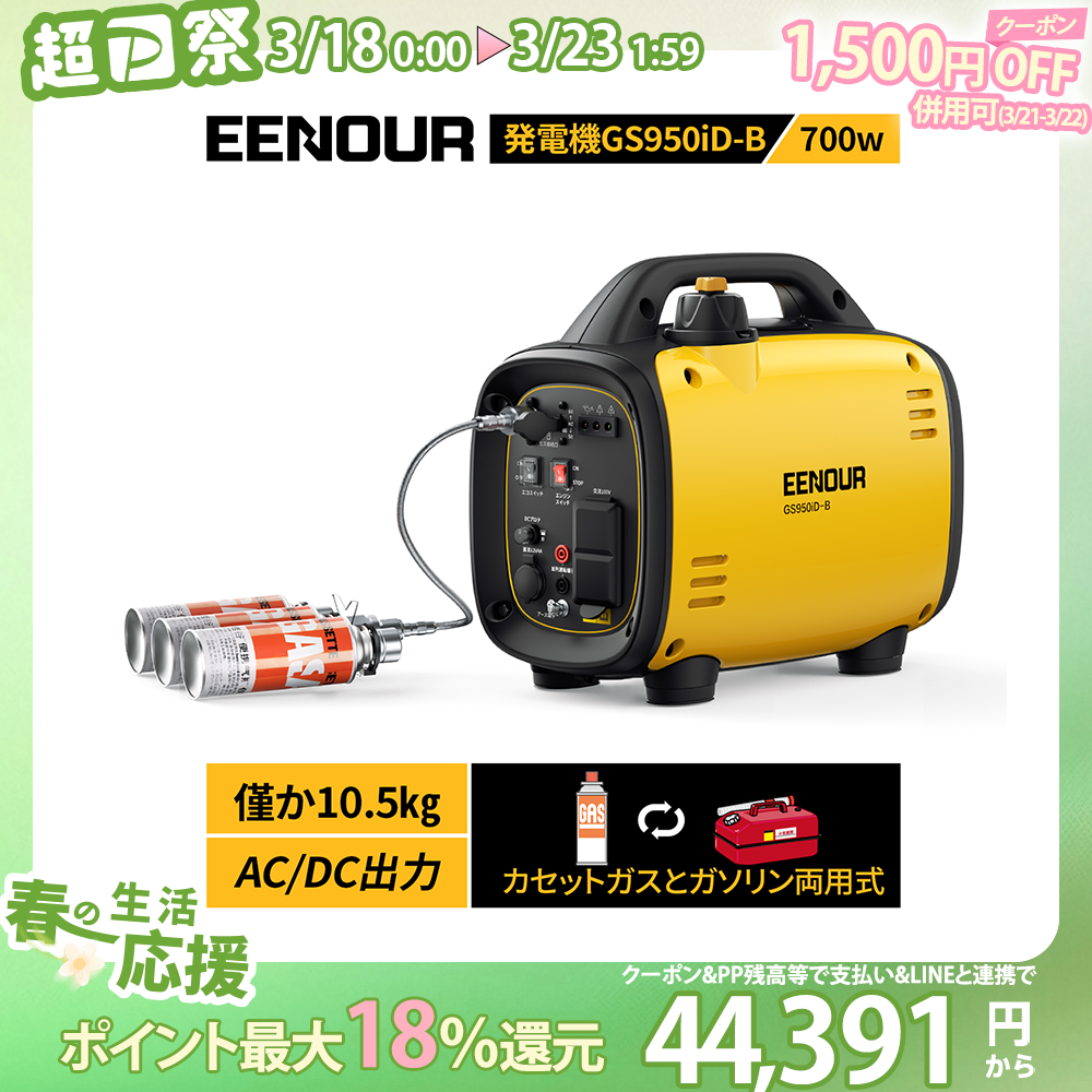 超日祭特価先行 インバーター発電機 EENOUR カセットボンベ ガソリン 2WAY 0.8kVA AC DC 出力 軽量 コンパクト 正弦波 静音 家庭用 防災 GS950iD-B 停電対策
