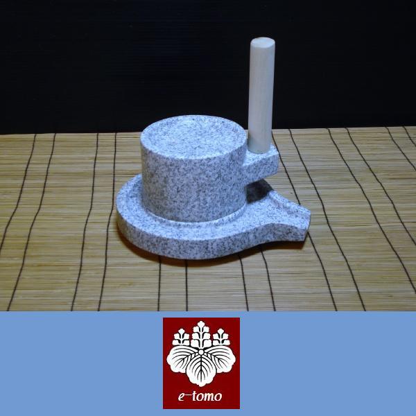 ★御影石 茶臼:(製品サイズ)上石:径13センチ・約4キロ、下石:短径21×長径24×高さ14センチ・約4キロ、総重量約8キロ