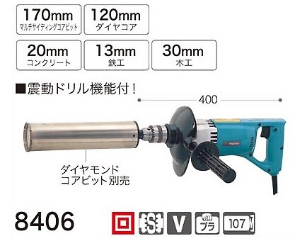 .穴あけ能力 マルチサイディングコアビット170mm・ダイヤモンドコアドリル120mm.コンクリートブロック20mm.鉄工13mm 木工30mm .チャック能力 2~13mm .回転数 0~1,500min-1(回転/分) .打撃数 0~22,500min-1(回/分) .電源 単相100V .電流 8A .消費電力 760W .コード 2.5m .質量 3.6 .寸法 400mm .標準付属品 チャックキー・サイドグリップ