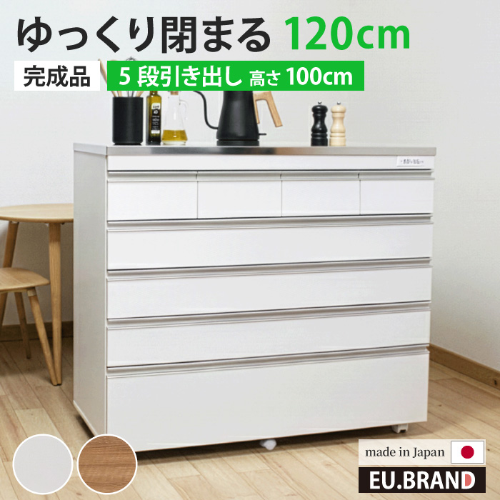 ステンレス天板の薄型キッチンカウンター、ハイタイプ5段引き出し