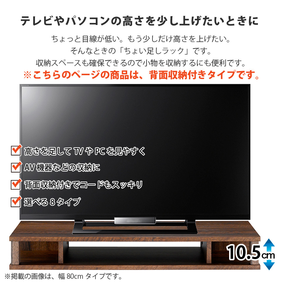 テレビの高さを少し上げたい時に。ちょい足しラックが大活躍!買い足したHDDやゲーム機、リモコンなどもスッキリ収納できます!完成品なので、お使いのテレビ台の上に置くだけ。すぐにお使いいただけます。また背面には、タップ収納とコード巻き収納がついているので、配線などをすっきりと綺麗に収納することができます。