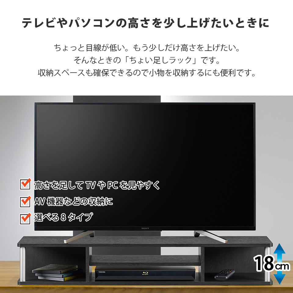 テレビの高さを少し上げたい時に。ちょい足しラックが大活躍!買い足したHDDやゲーム機、リモコンなどもスッキリ収納できます!完成品なので、お使いのテレビ台の上に置くだけ。すぐにお使いいただけます。
