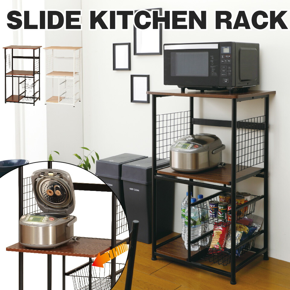 ●商品説明:スタンダードな機能を詰め込んだレンジラック。天板にはレンジ・トースターなどの家電を、中棚とカゴはスライド棚となっており、ケトルや炊飯ジャーなどの水蒸気が出る家電を置くことに適しております。また、スライド棚は一時的にお茶碗やお皿などをちょっと置く、一時スペースにお使いいただけます。カゴにはお菓子やトマト缶、パスタなどを置いたりするのに大変便利。下棚には背の高いペットボトルやコーンフレークなどの箱ものを収納することができます。サイドのメッシュ部分はS字フックやラックなどを引っ掛けて使えるので便利です。