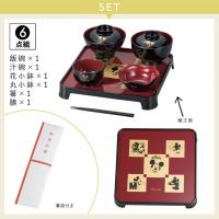 ■サイズ:飯碗/直径10.4×高さ7、汁椀/直径10×高さ7、花小鉢/直径9.5×高さ3.7、丸小鉢/直径7.2×高さ4.2、箸/長さ18.5、膳/幅22.5×奥行き22.5×高さ3.2cm■容量:飯碗/230、汁椀/260、花小鉢/115、丸小鉢/115ml■材質:ABS樹脂■塗り:ウレタン塗装■セット内容:飯碗×1、汁椀×1、花小鉢×1、丸小鉢×1、箸×1、膳×1■原産国:日本■備考:箸袋付き