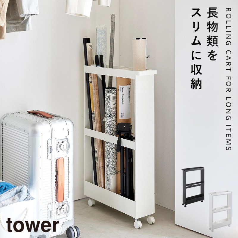 キャスター付き 長物収納スリムワゴン タワー 山崎実業 tower スリムワゴン キャスター付き ワゴン スリム クローゼット収納 おしゃれ モノトーン ホワイト ブ