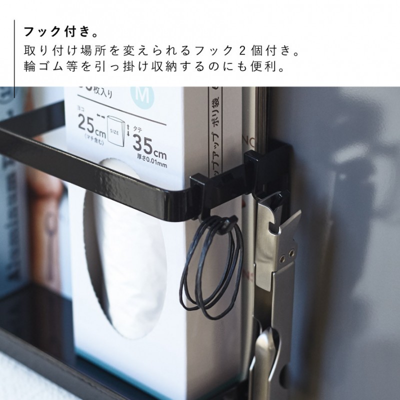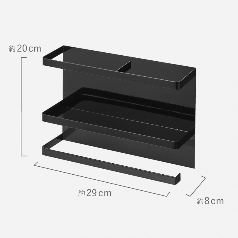 ■サイズ:本体/幅29×奥行8×高さ20、内寸/左側ホルダー幅16×奥行き7.5×高さ12.5、右側ホルダー幅12.5×奥行き7.5×高さ12.5cm■対荷重:約2kg、フック1つあたり約250g■対応サイズ:直径約15×高さ28cm以内、芯の直径約3.6cm以上のキッチンペーパーロール■材質:スチール(粉体塗装)、マグネット■付属品:フック×2■原産国:中国■シリーズ名:タワー(山崎実業)