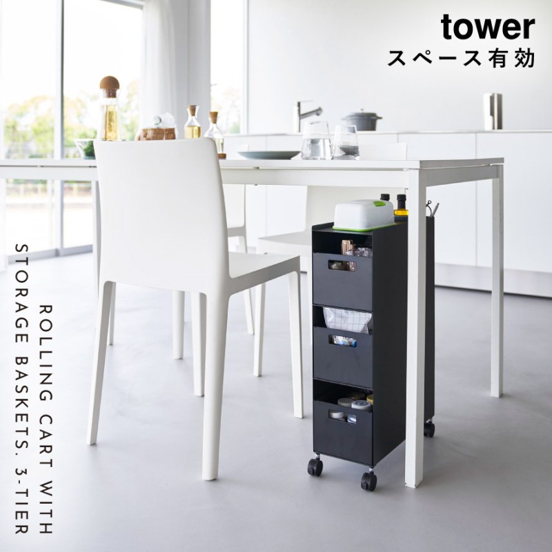 収納バスケットワゴン タワー 3段 山崎実業 tower テーブル下 収納 ワゴン デスク下 キャスター付き おしゃれ モノトーン ホワイト ブラック 10015 10016 メー