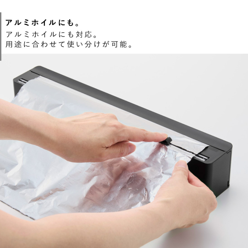 ■サイズ:幅35.2×奥行5.9×高さ7cm■重量:435g■材質:本体/ABS樹脂、レール部/塩化ビニル樹脂、スライダー部/ポリアセタール 刃/ステンレス鋼、マグネット、滑り止め/シリコーンゴム■対応サイズ:幅31cm以内(紙管含む) ロールの直径4.7cm以内(50m・100m巻等)・紙管の内径2.5cm以上のラップ・アルミホイル ※ラップ・アルミホイルの種類やサイズ・厚さによっては取り付けできない場合があります。■耐荷重:500g(静止荷重)■耐熱・耐冷:耐熱/60度、耐冷/-40度■原産国:中国■備考:マグネットで設置可能な面 マグネットがつく凹凸のない平らな面・スチール面■シリーズ名:タワー(山崎実業)