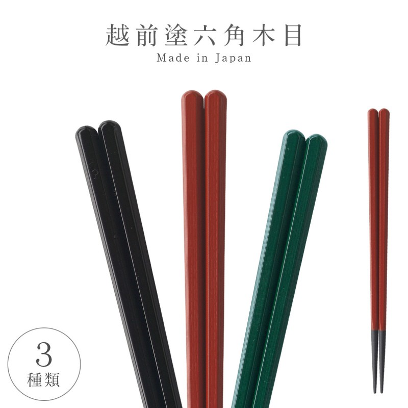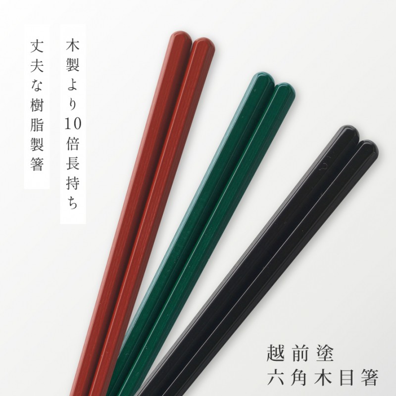 箸 お箸 日本製 越前塗 業務用食洗機対応 食洗器対応 樹脂製 丈夫 強度 耐熱 六角木目箸 20.5cm 22.2cm 男性用 女性用 赤 黒 緑 無地 模様 洗練 家庭用 自宅用
