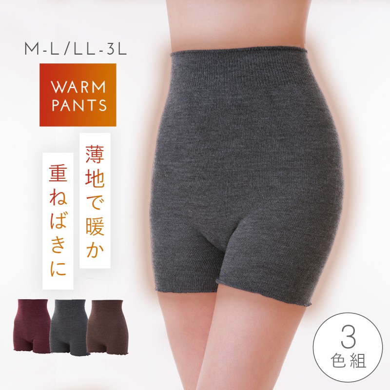 ■サイズ:M-L/ヒップ87-100、LL-3L/ヒップ97-110cm■材質:アクリル85%、ポリエステル15%■重量:M-L/215g、LL-3L/290g(3色組)■原産国:中国■セット内容:3色組■備考:乾燥機使用禁止。