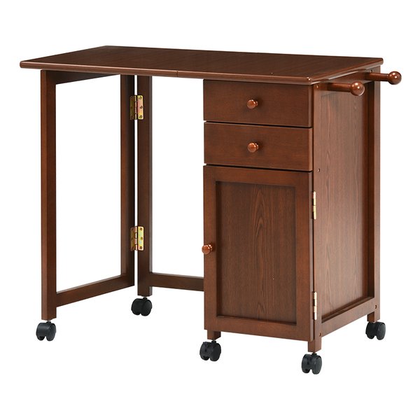 使わないときは天板をたたんで収納できる■キャスター付きデスク。引出しや扉収納もあって便利。