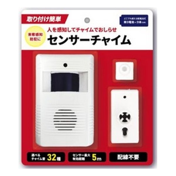 人を検知してチャイムでお知らせ。防犯対策・来客感知に。チャイム音は32種。センサー最大有効距離は5m。