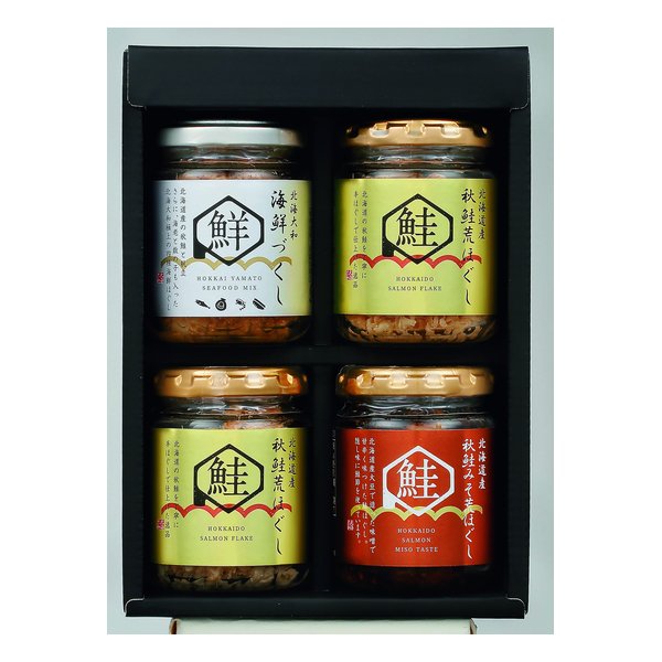 ●秋鮭やえび、ホタテ、数の子など、化学調味料不使用で仕上げた自然な味わいが楽しめる海産物フレーク詰合わせギフトです。