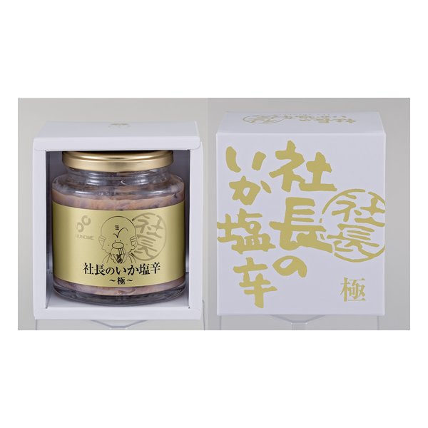 社長のいか塩辛極 :スルメイカ (国産)、いか肝臓、食塩、砂糖、みりん、青南蛮、たん白加水分解物(小麦・大豆を含む)、かつお節粉末、酵母エキス、かつおエキス/ソルビット、調味料(アミノ酸等)、酒精、増粘剤(キサンタンガム)