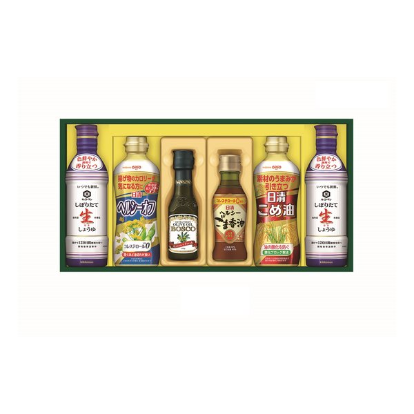 BOSCOオリーブオイル、日清ヘルシーオフ、日清こめ油に、キッコーマン「いつでも新鮮」シリーズの生しょうゆを詰め合わせたギフト
